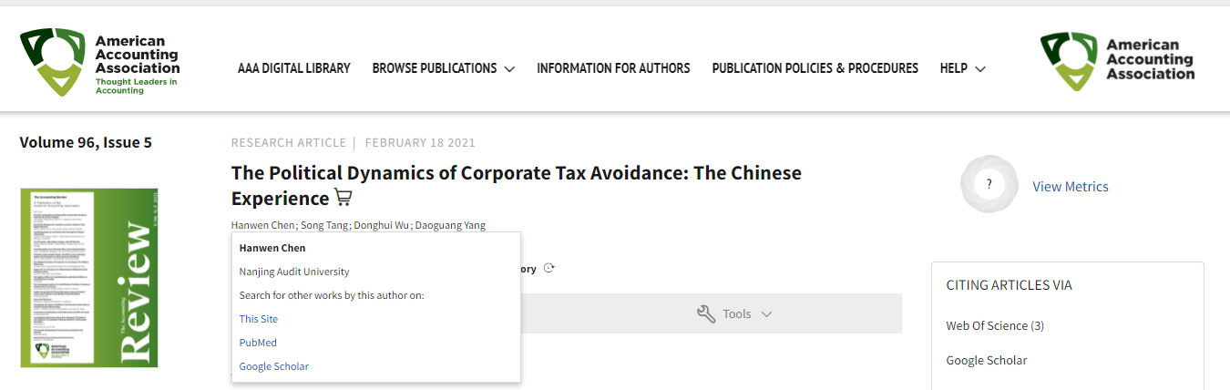 近日,DB电竞陈汉文教授的合作论文“The politic dynamics of corporate tax avoidance: The Chinese experience”在美国《会计评论》(The Accounting Review,TAR)在线发表。该期刊是UT Dallas界定的24本国际顶级商科期刊之一,与Journal of Accounting Research (JAR)以及Journal of Accounting and Economics (JAE)被公认为国际“三大”顶尖(TOP 3)会计学刊。该成果是公司会计审计学科第一篇在国际顶尖学刊发表的论文。